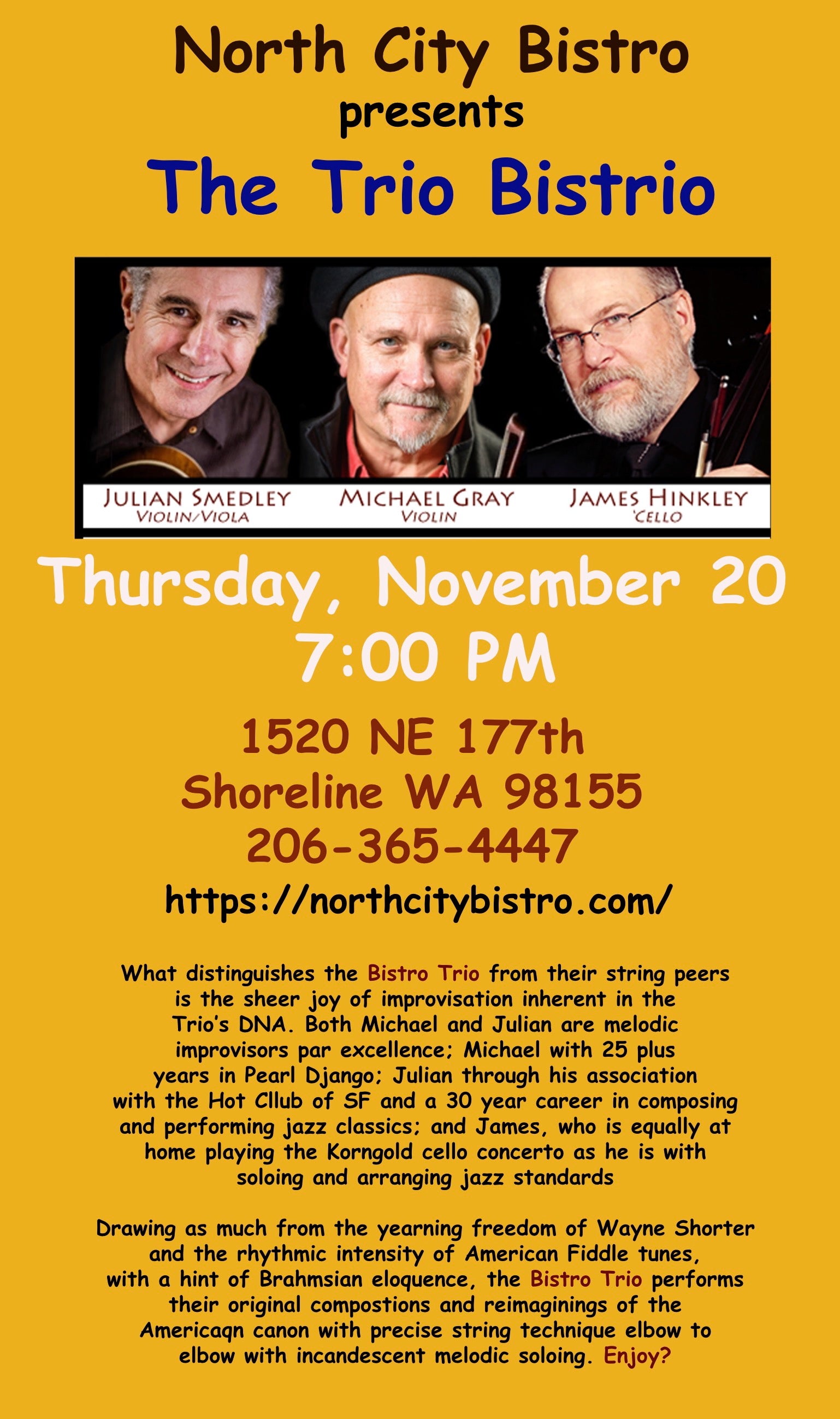 JULIAN SMEDLEY has been singing and playing for his supper from an early age. Starting at age 10 as a singer in the prestigious cathedral choir at Christ Church College in Oxford, he went on to collaborate with seminal British folk rock bands in England, including working with members of the infamous Bonzo Dog Doo-Dah Band while under contract to Decca records. After moving to the US, his credits include stints as a violinist with Dan Hicks, Paul Horn, The Hot Club of San Francisco, Clubfoot Orchestra, and Seattle’s Composer and Improvisors Orchestra. A consummate musician, record producer, sound designer, and recording artist, he currently performs in a duo with his wife Alison Odell and with Trio Bistro as well as with other local bands. His recent 12 original song collaboration with The Palace Thieves collective, “When We Were Swans’ will be released later this year.